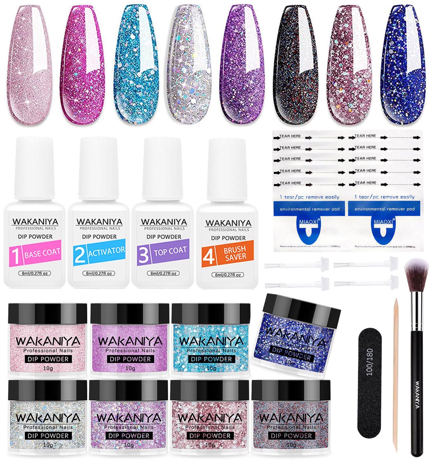 - 〖Complete Nail Powder Dip Kit with Everything You Need〗wakaniya dipped nails starter kit with gift box, a great gift choice for halloween, christmas etc, contains 8 x10g acrylic dip nail powders, 4 x 8ml gel base activator and top coat, brush saver, 1 x nail file,1 x brush, 1 x wood stick, 4 x replacement brush, 10 x nail remover wraps, all in one dip nail powder kit, no need to buy anything else, save your money to diy dip powder nails at home.